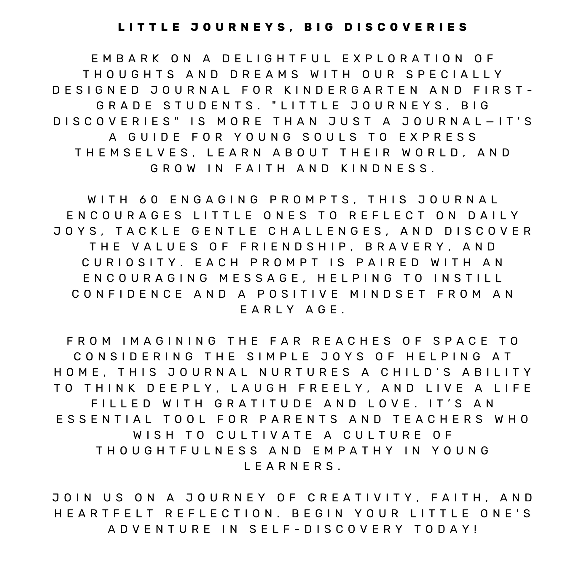 Embark on a delightful exploration of thoughts and dreams with our specially designed journal for kindergarten and first-grade students. "Little Journeys, Big Discoveries" is more than just a journal—it's a guide for young souls to express themselves, learn about their world, and grow in faith and kindness.